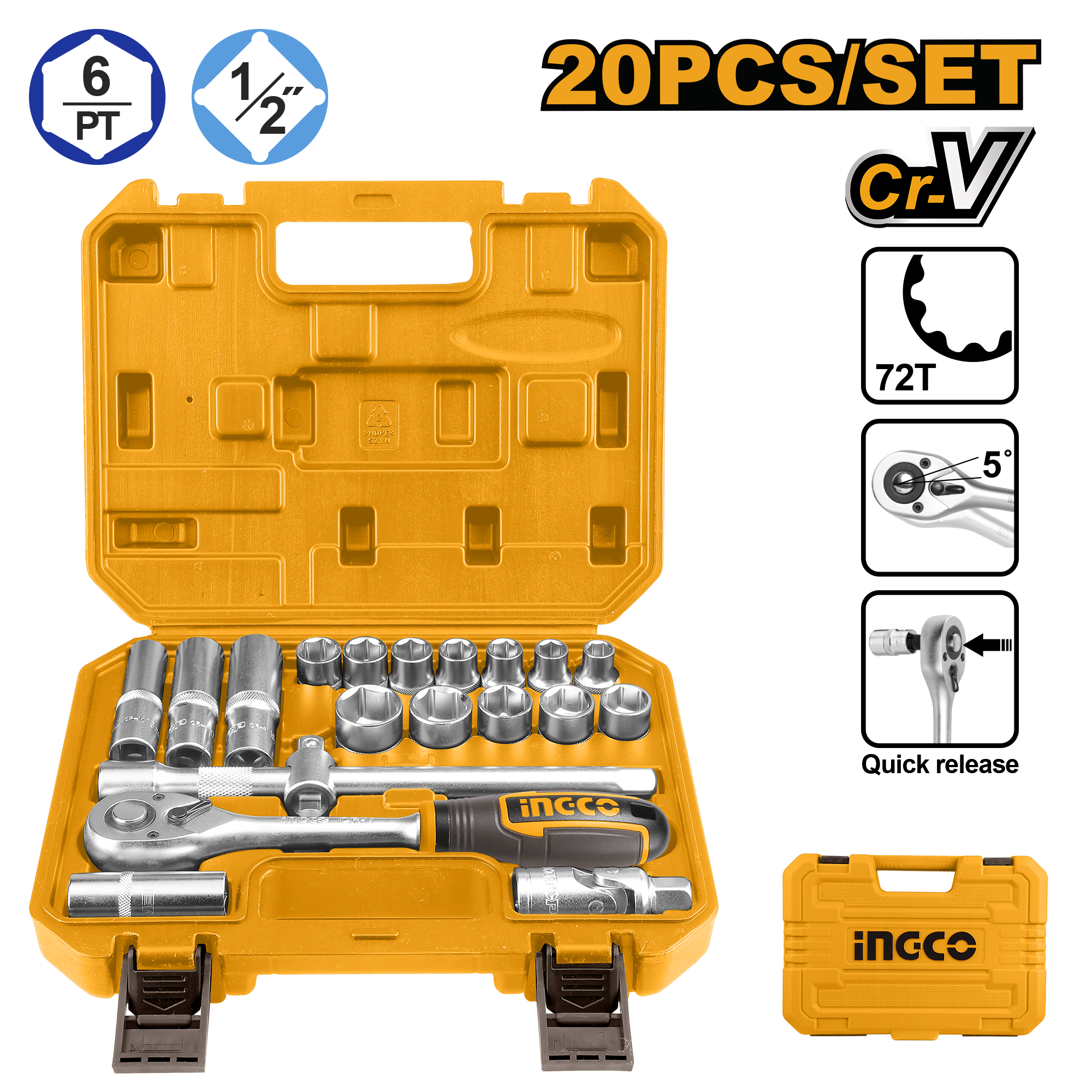 / JOGO DE SOQUETES COM ENCAIXE DE 1/2″ C/20 PC MALETA DE PLÁSTICO INGCO HKTS12201