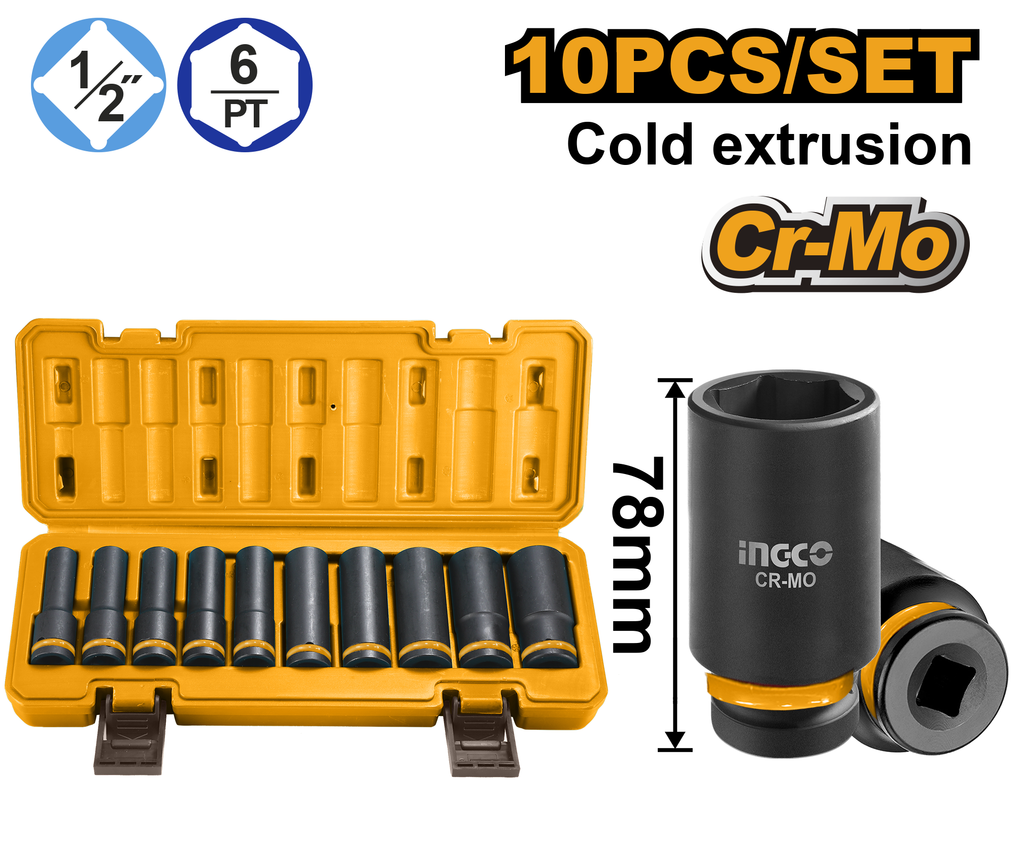 / JOGO SOQUETE IMPACTO 1/2″ LONGO 78MM C/10PC INGCO HKISSD12102L